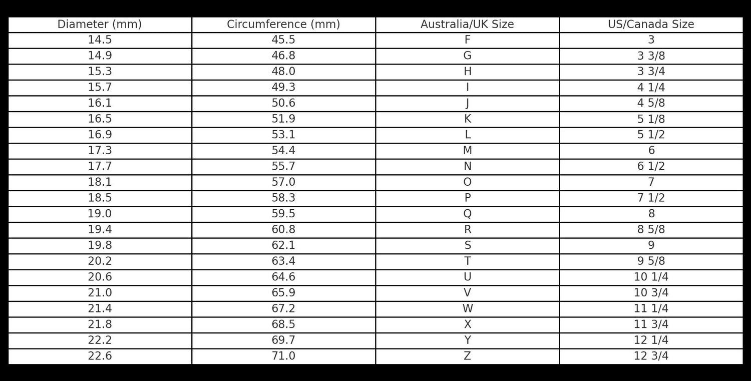 To determine your ring size, measure the inside diameter or inside circumference of a ring that fits you well. Match the measurement to the corresponding size in the chart below. if you still need some help getting the right fit feel free to reach out.