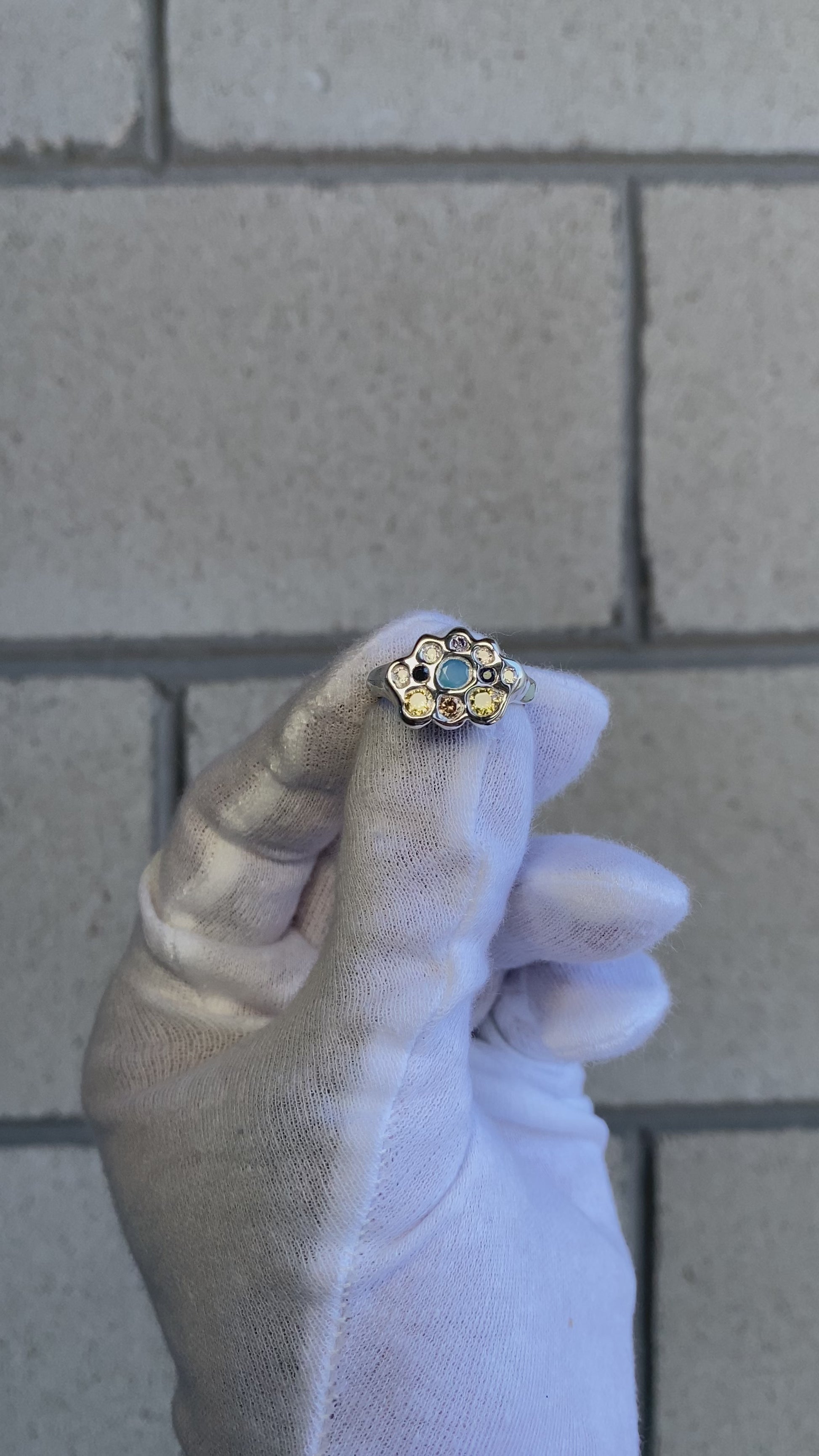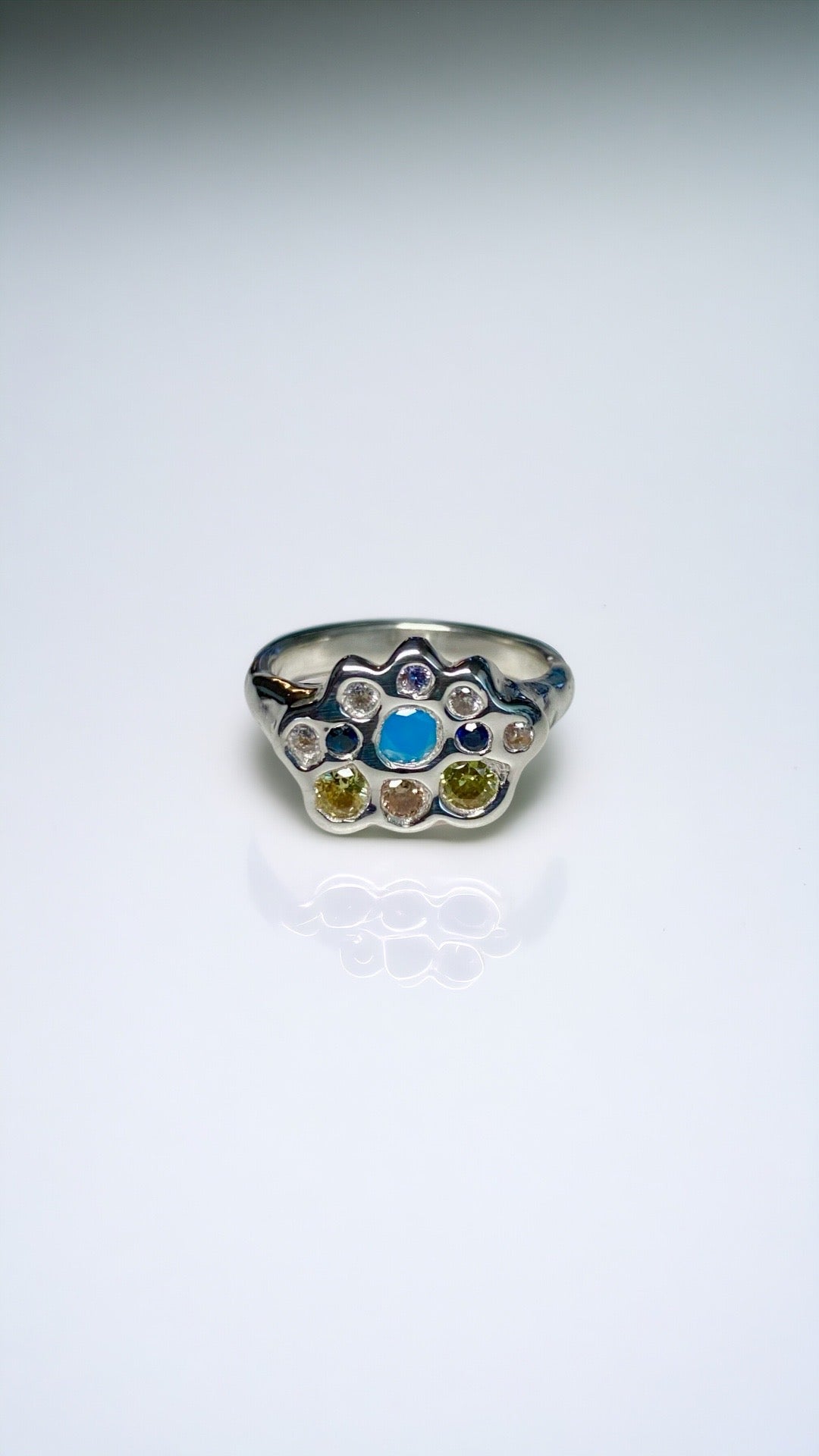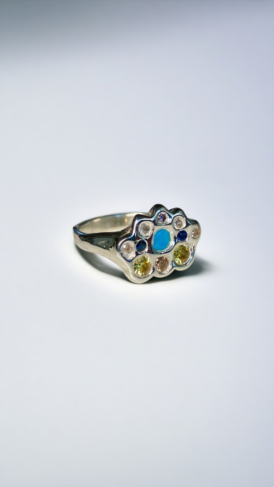 An indulgent 11 multi coloured and sized cubic zirconias individually set into a honeycomb inspired signet. Like all of my silver pieces this one is 100% solid 925 sterling and made to last.