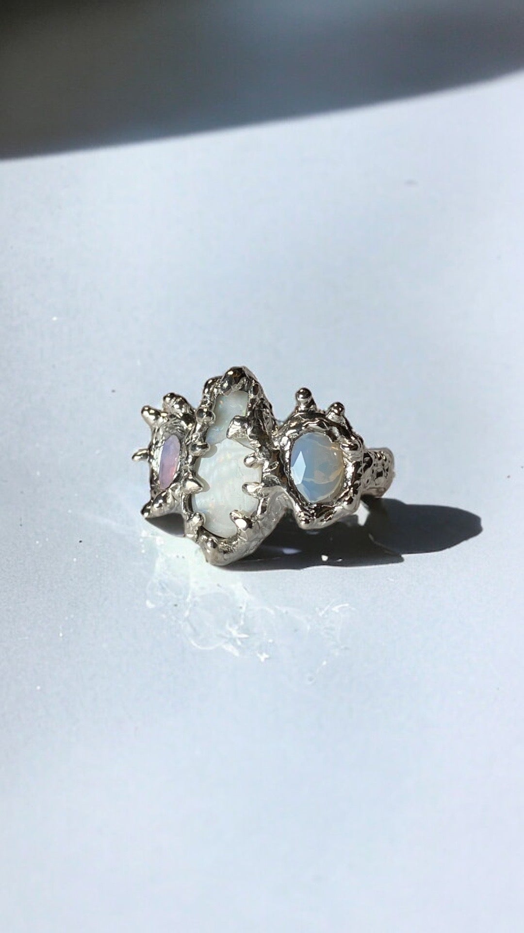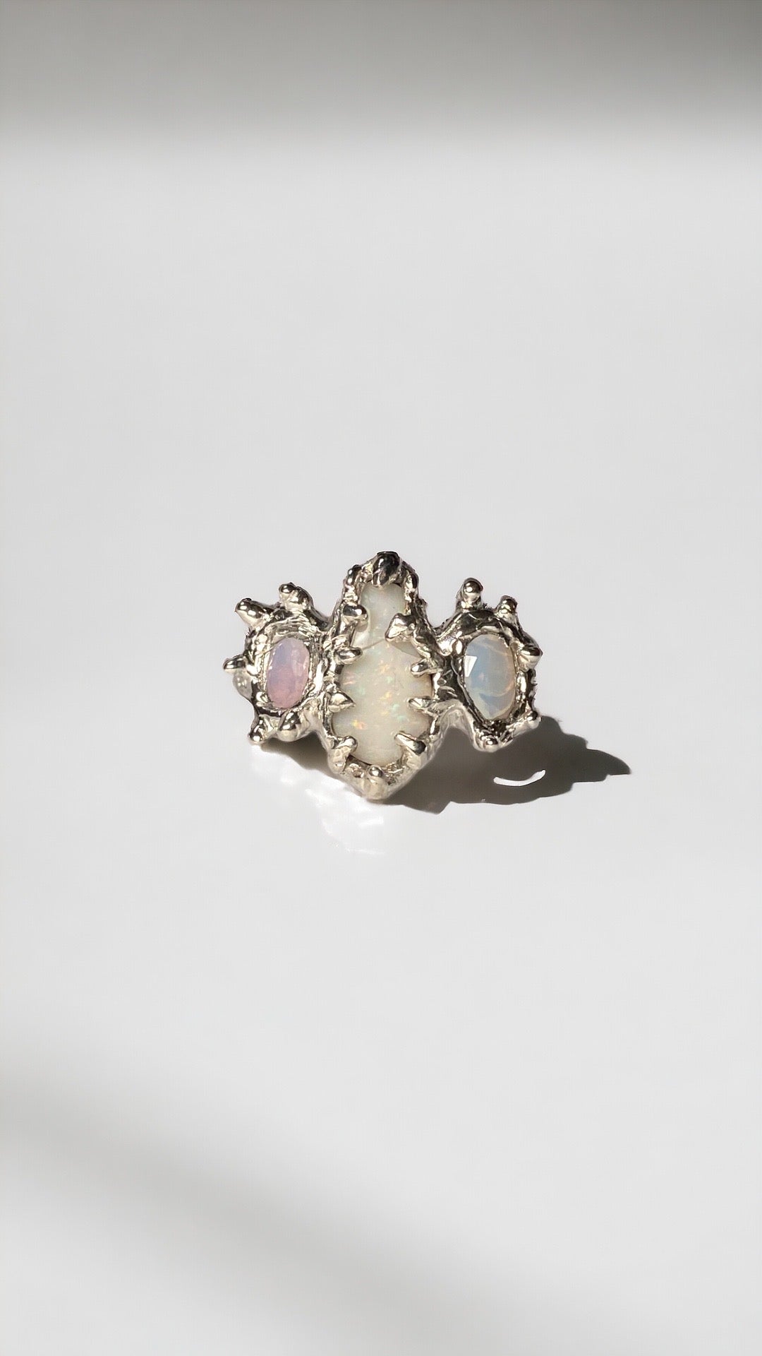 A bright white & speckled Australian solid opal sidelined by two pale blue nano lab opals.