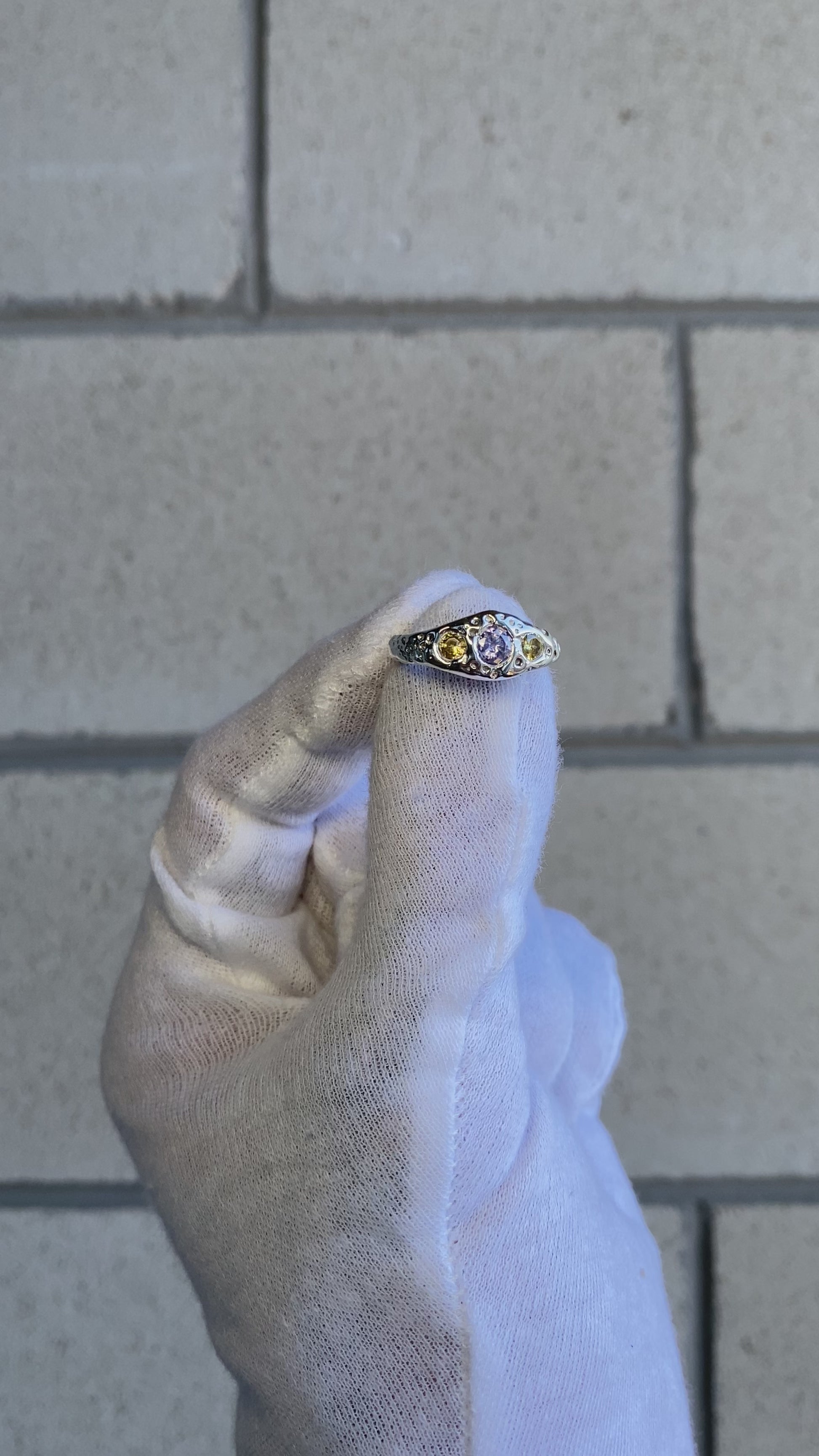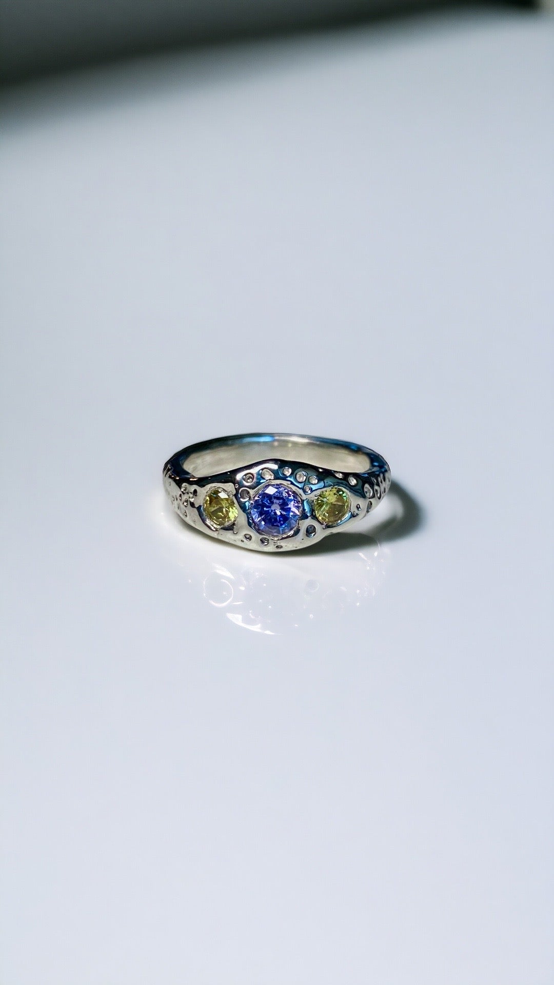 cobalt & lemon cubic zirconias set in a modest but textured 925 sterling signet with a high mirror polish.