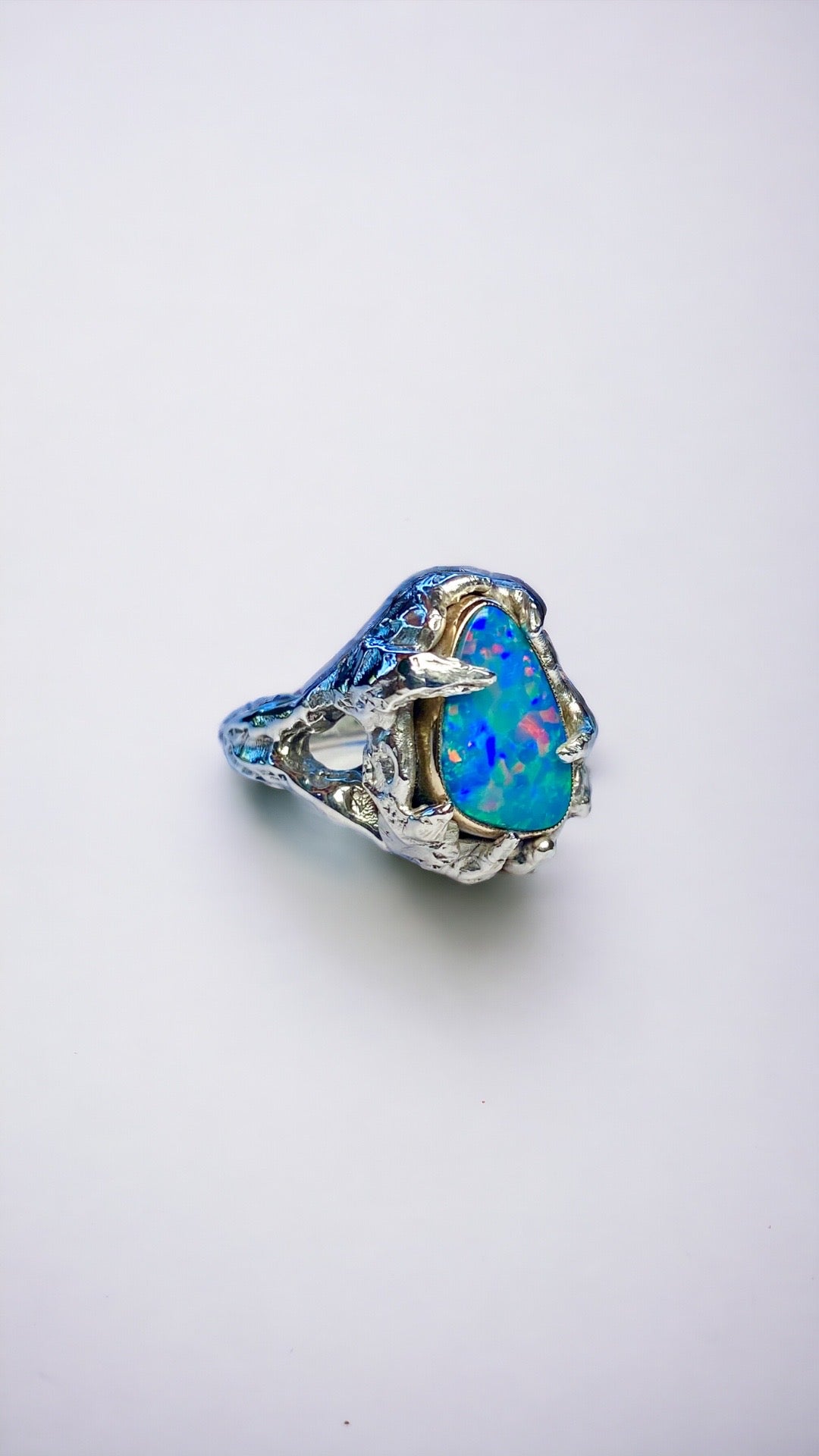 Australian Boulder Opal set in a fine 9ct bezel clutched snug within the claws of a chunky sterling silver band.