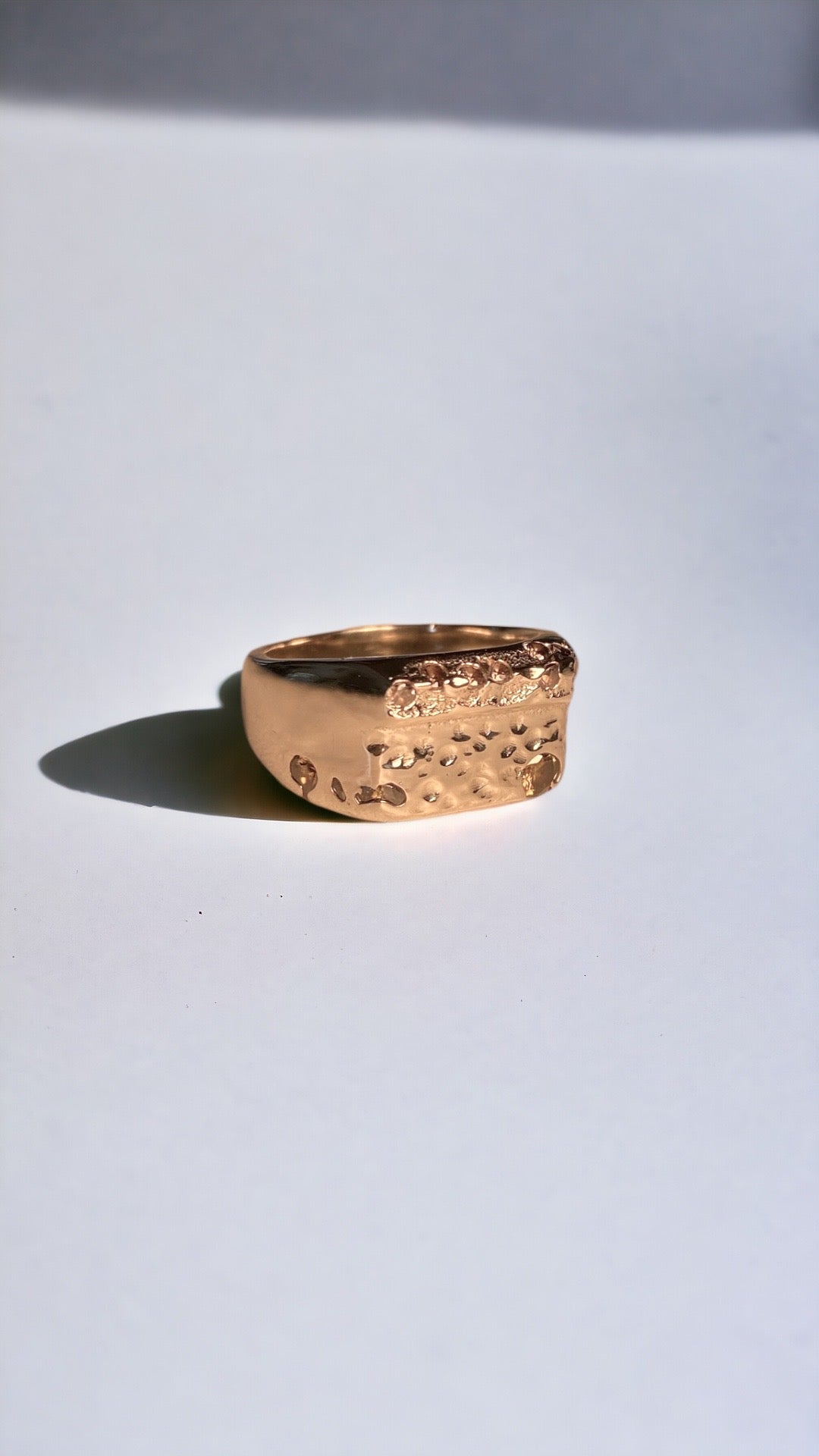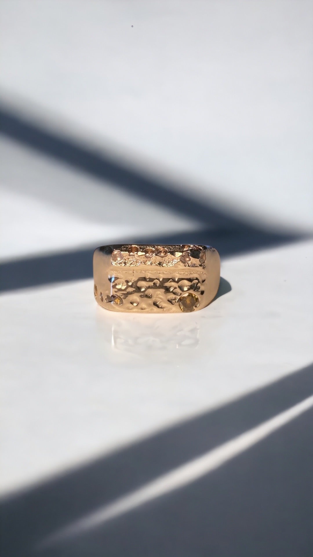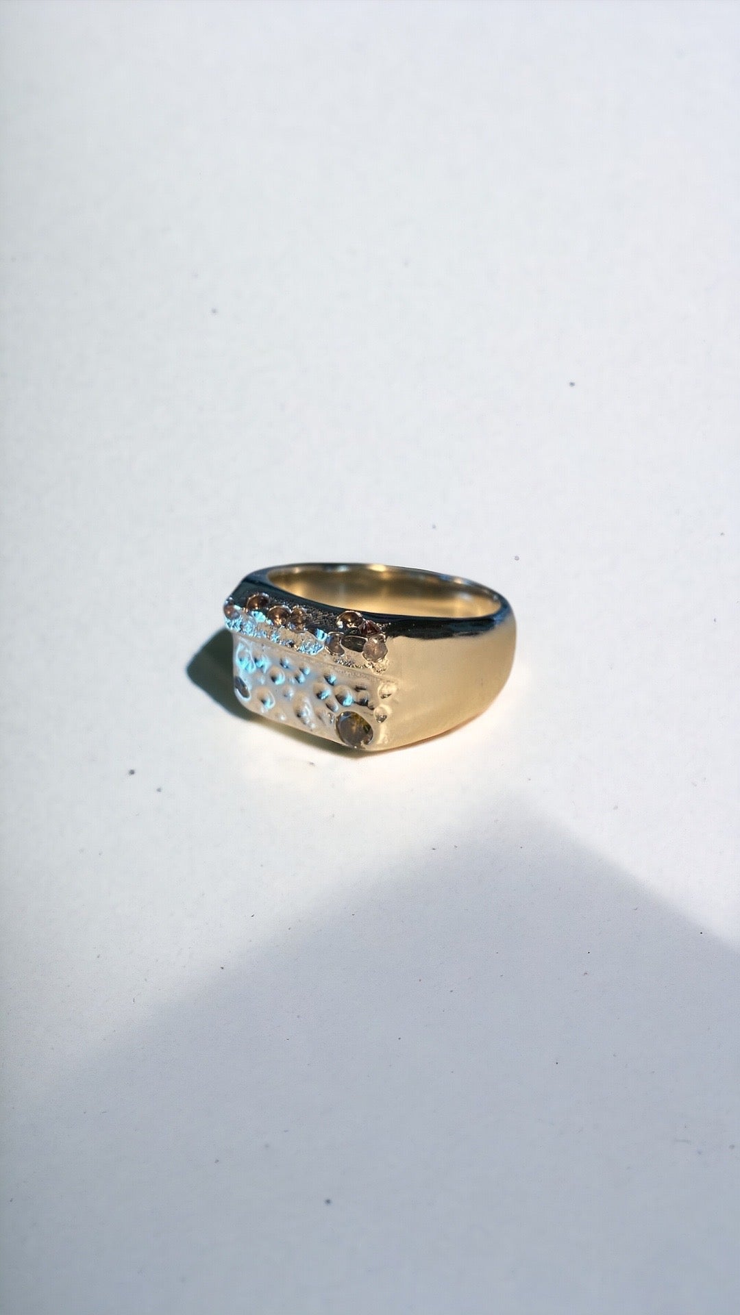 Solid 9K yellow gold sand cast signet sprinkled with 3 yellow & 8 white zircons in a textured face with a smooth high polished band.Β