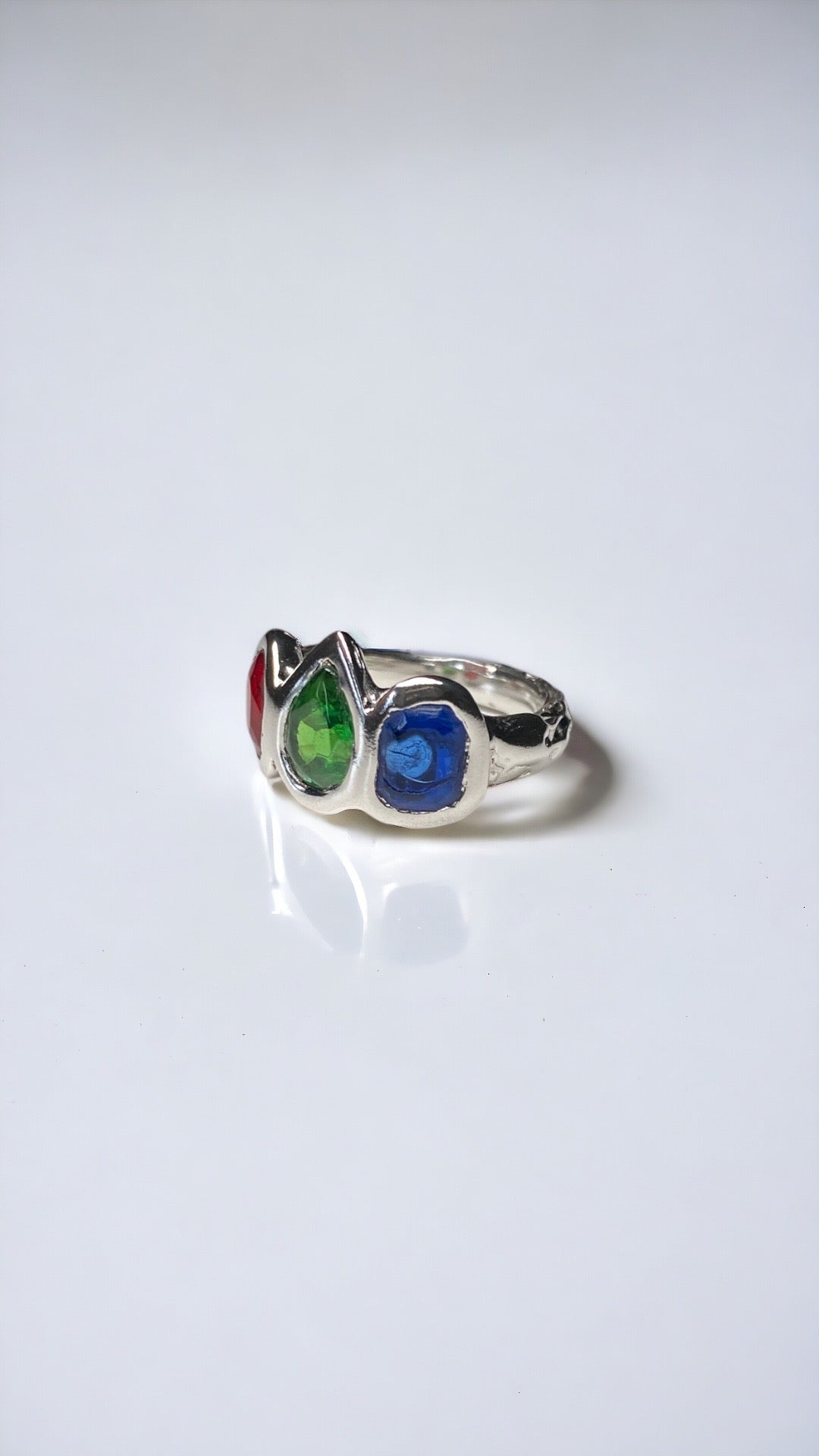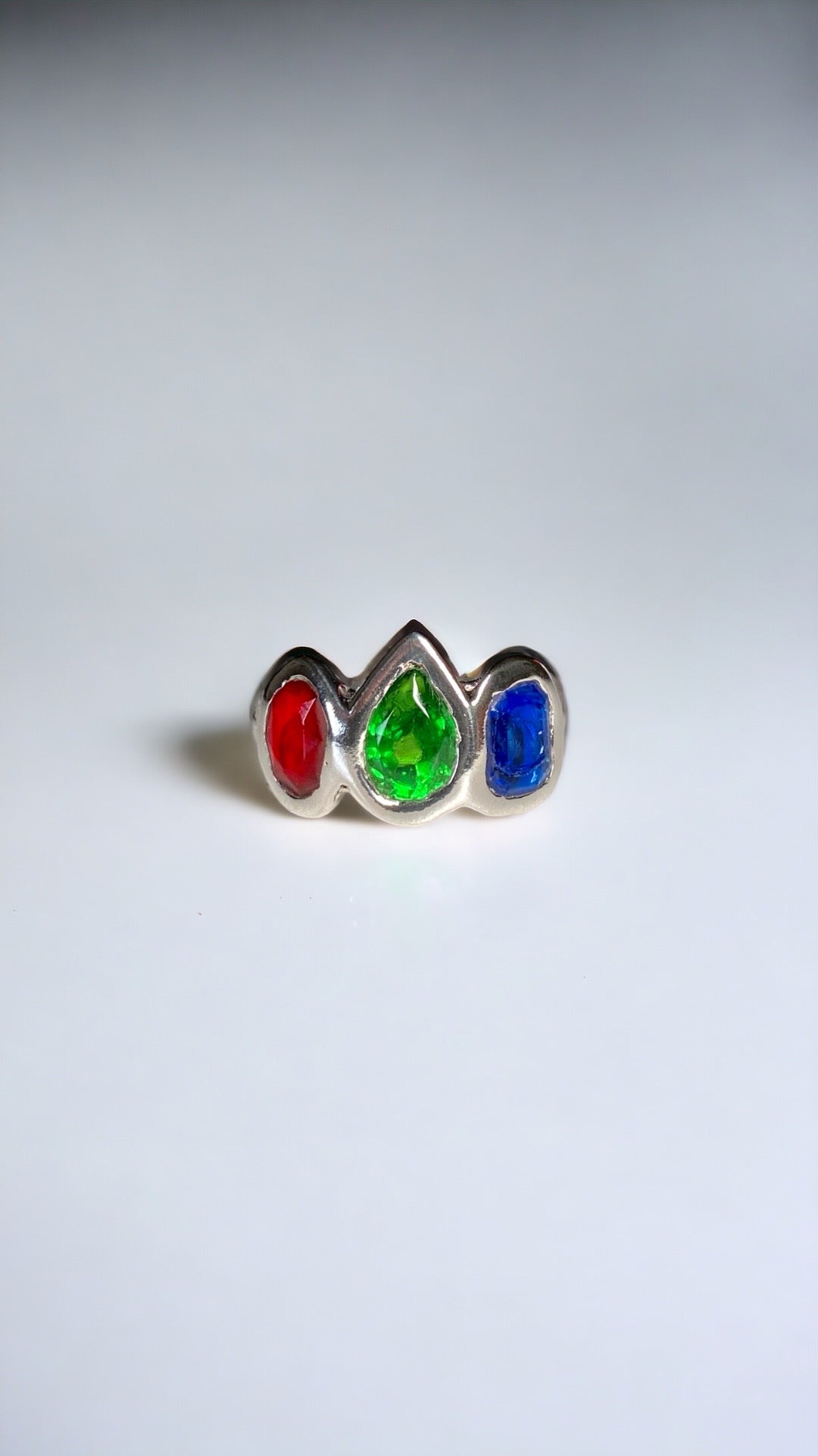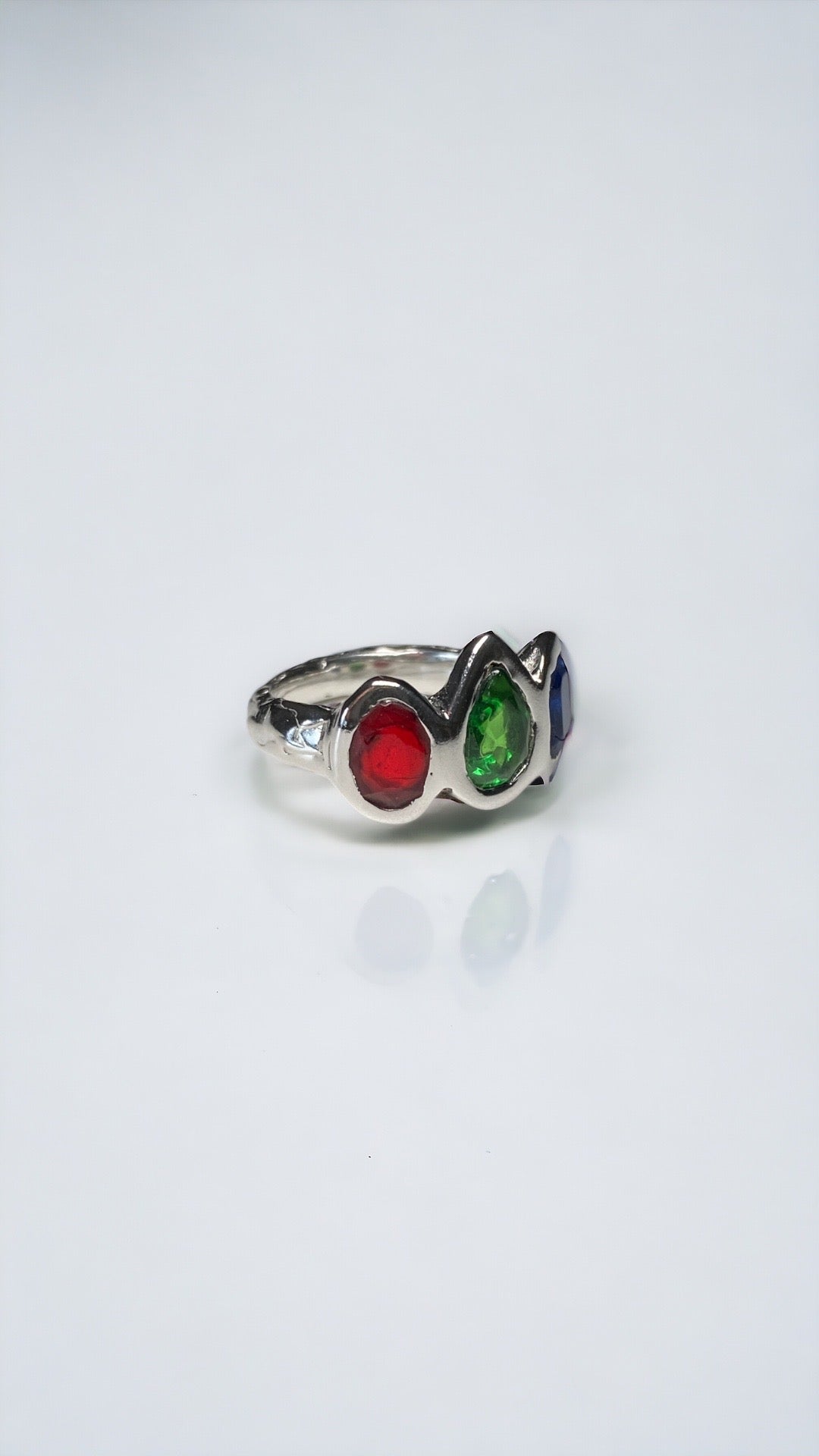 Blood red and royal blue zircon surround a pear cut lab emerald