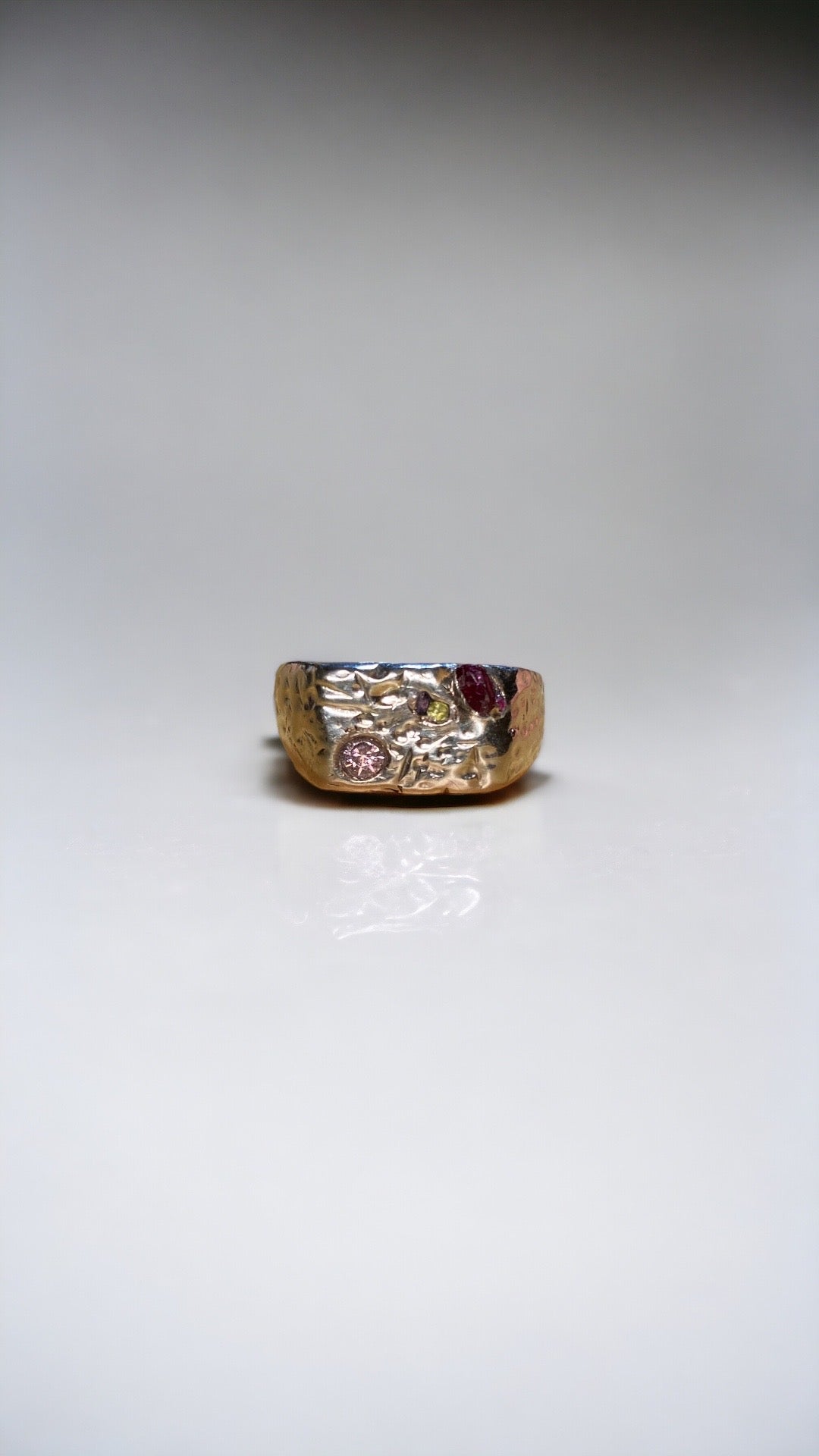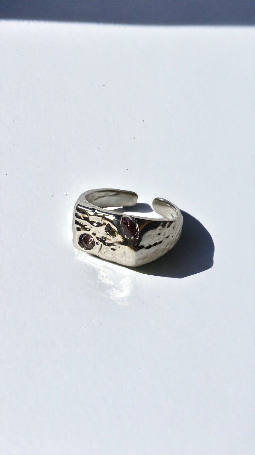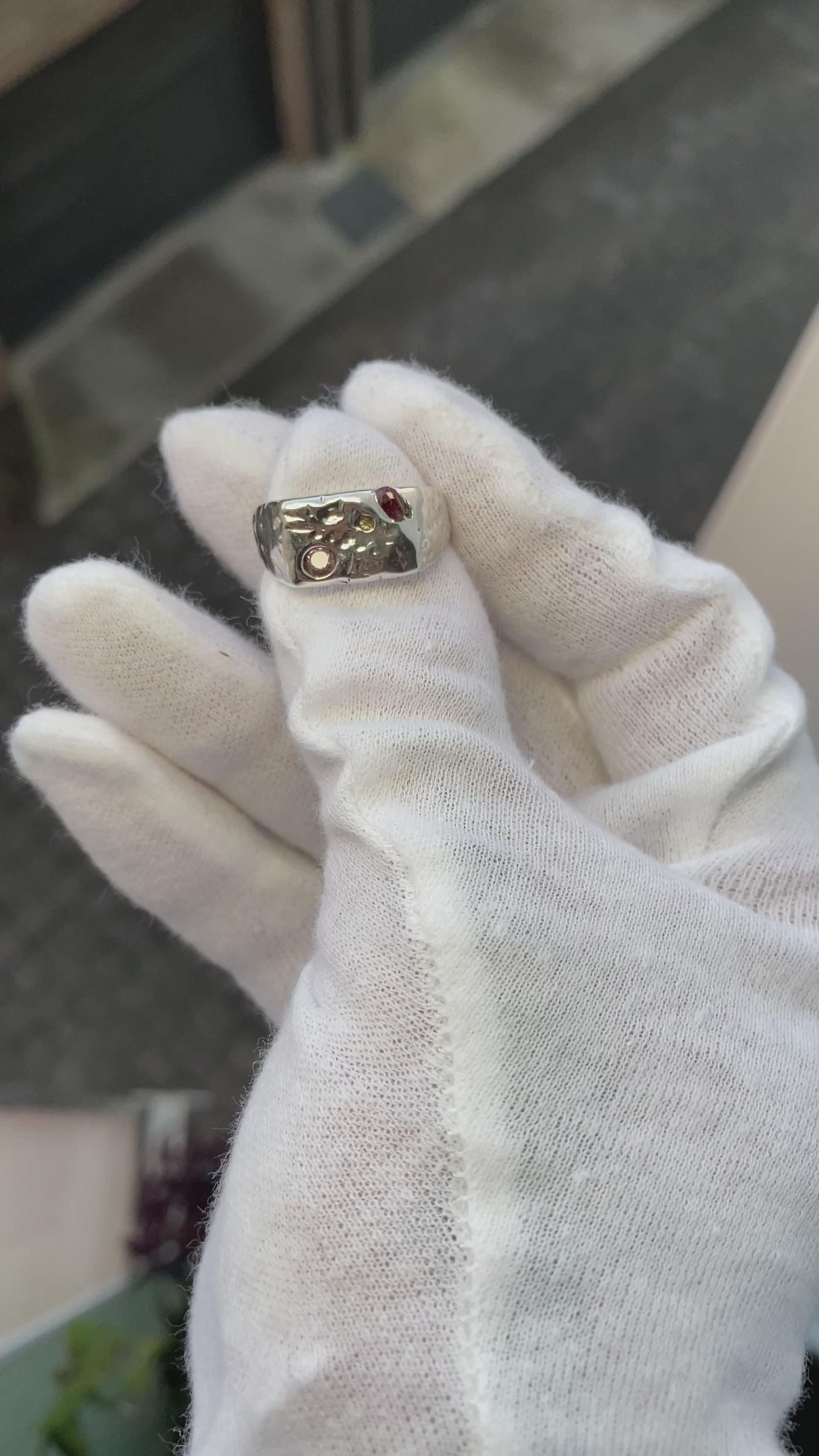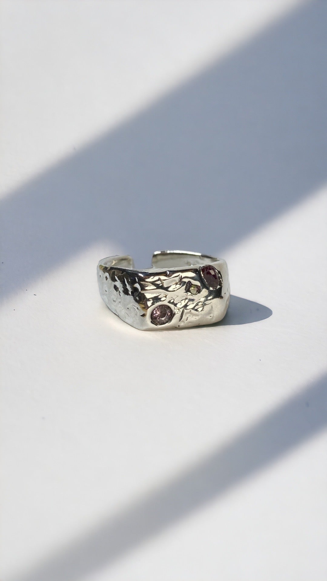 Recycled 925 sterling silver speckled with loose cubic zirconias & a rough cut ruby